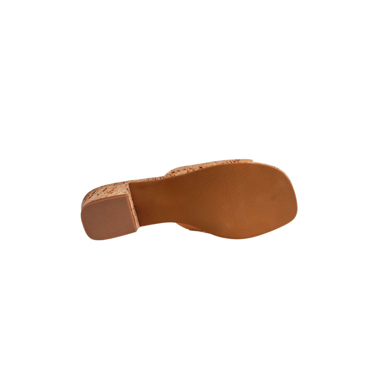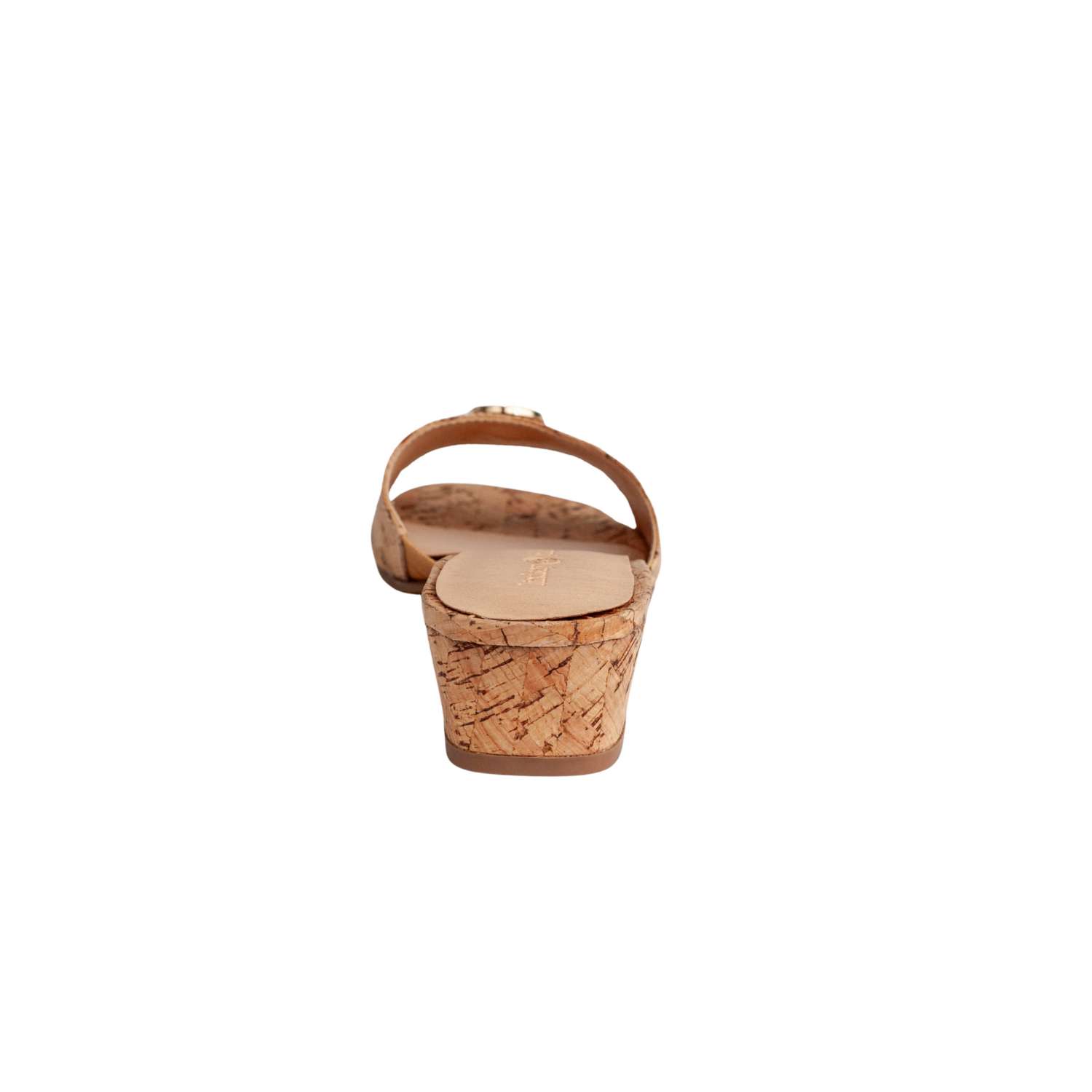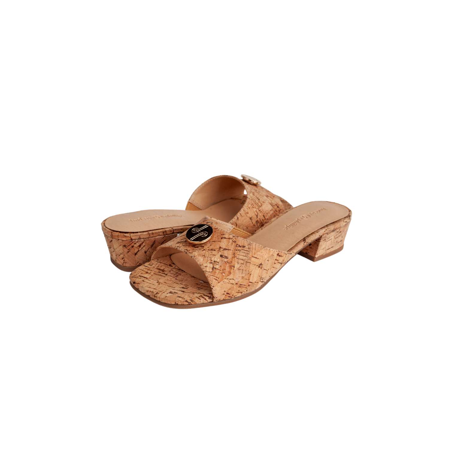 The Addison Cork is a cork textured 1 1/2" block heel sandal with gold LP logo signature snap.