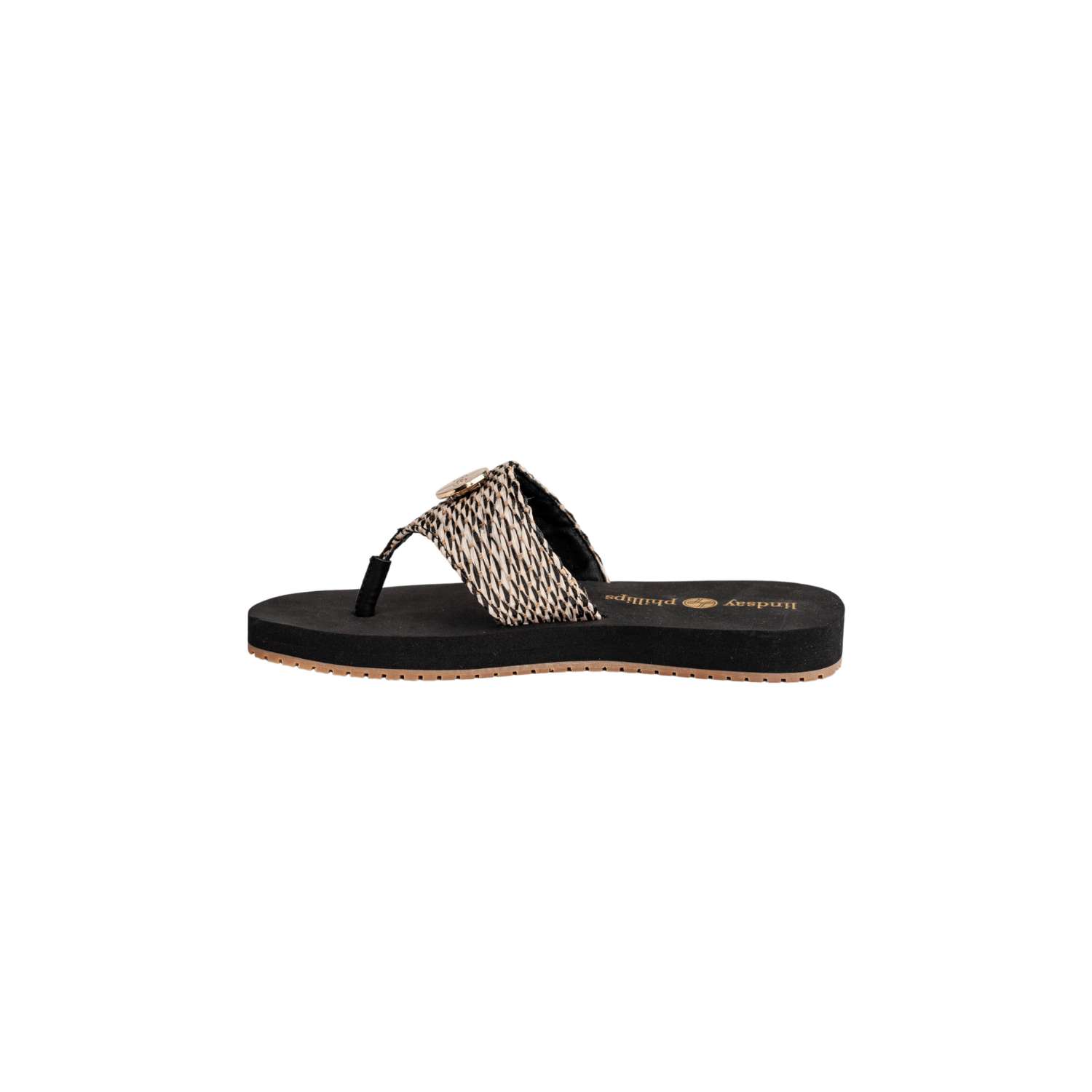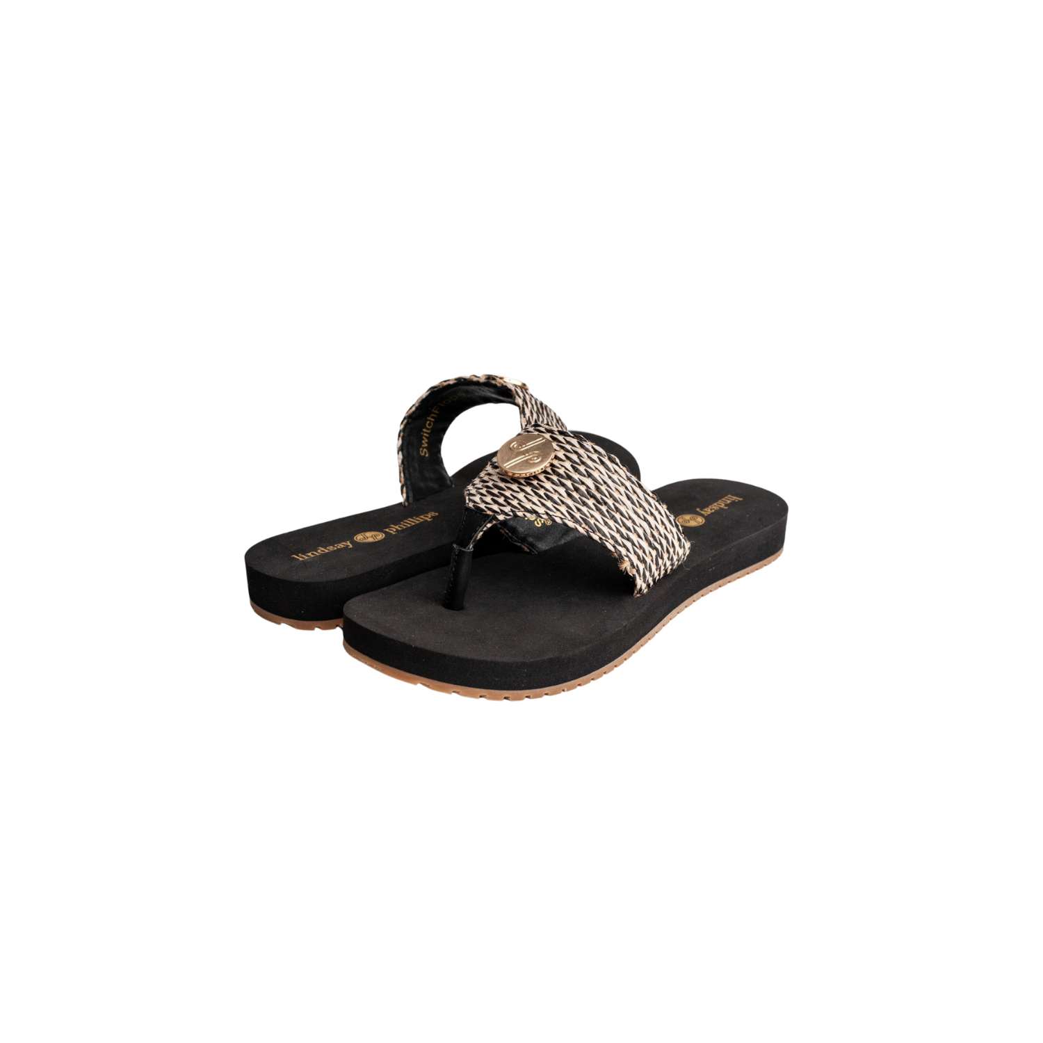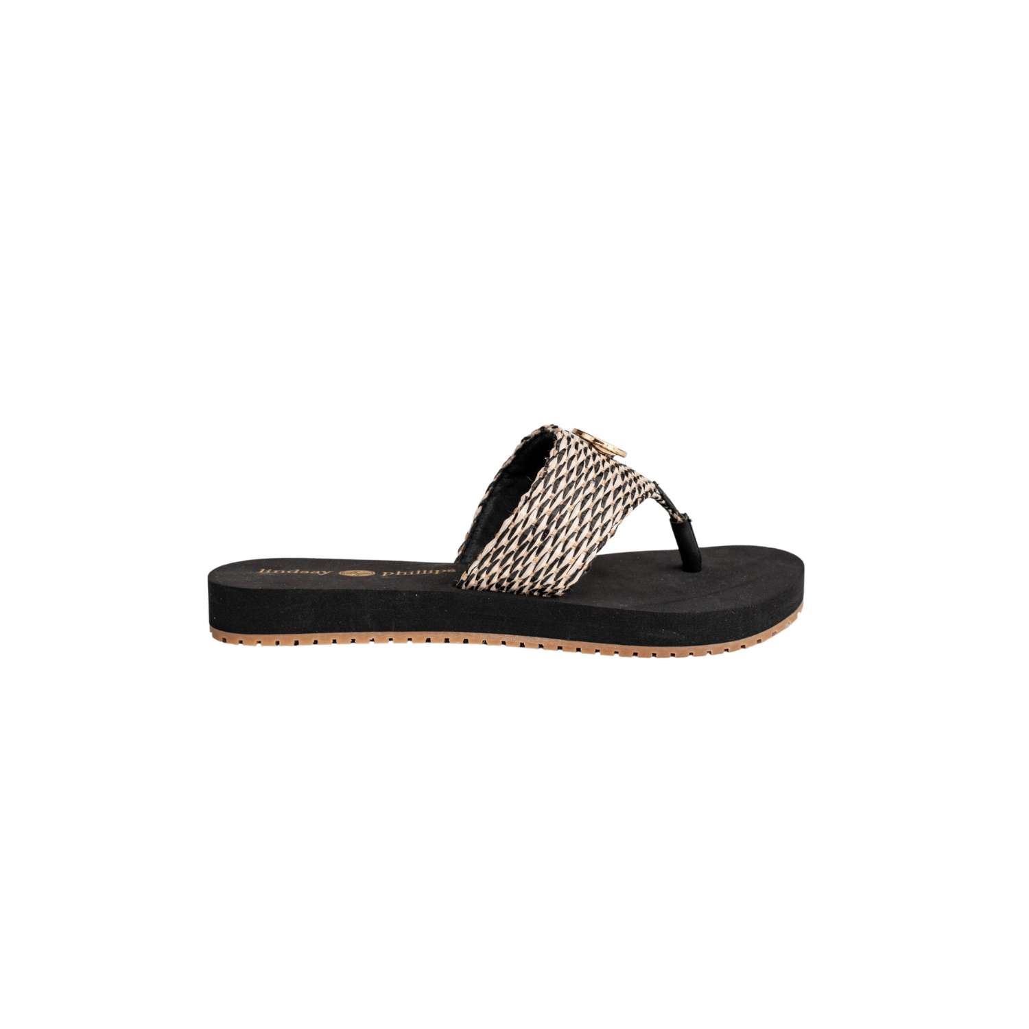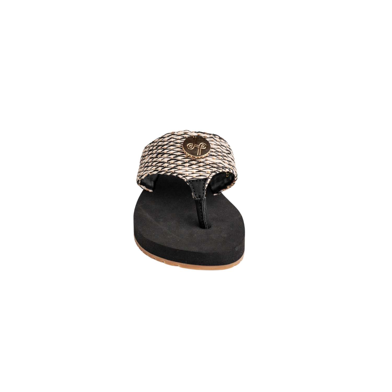 The Brylee is a black flip-flop with woven PU strap and gold LP logo signature snap.