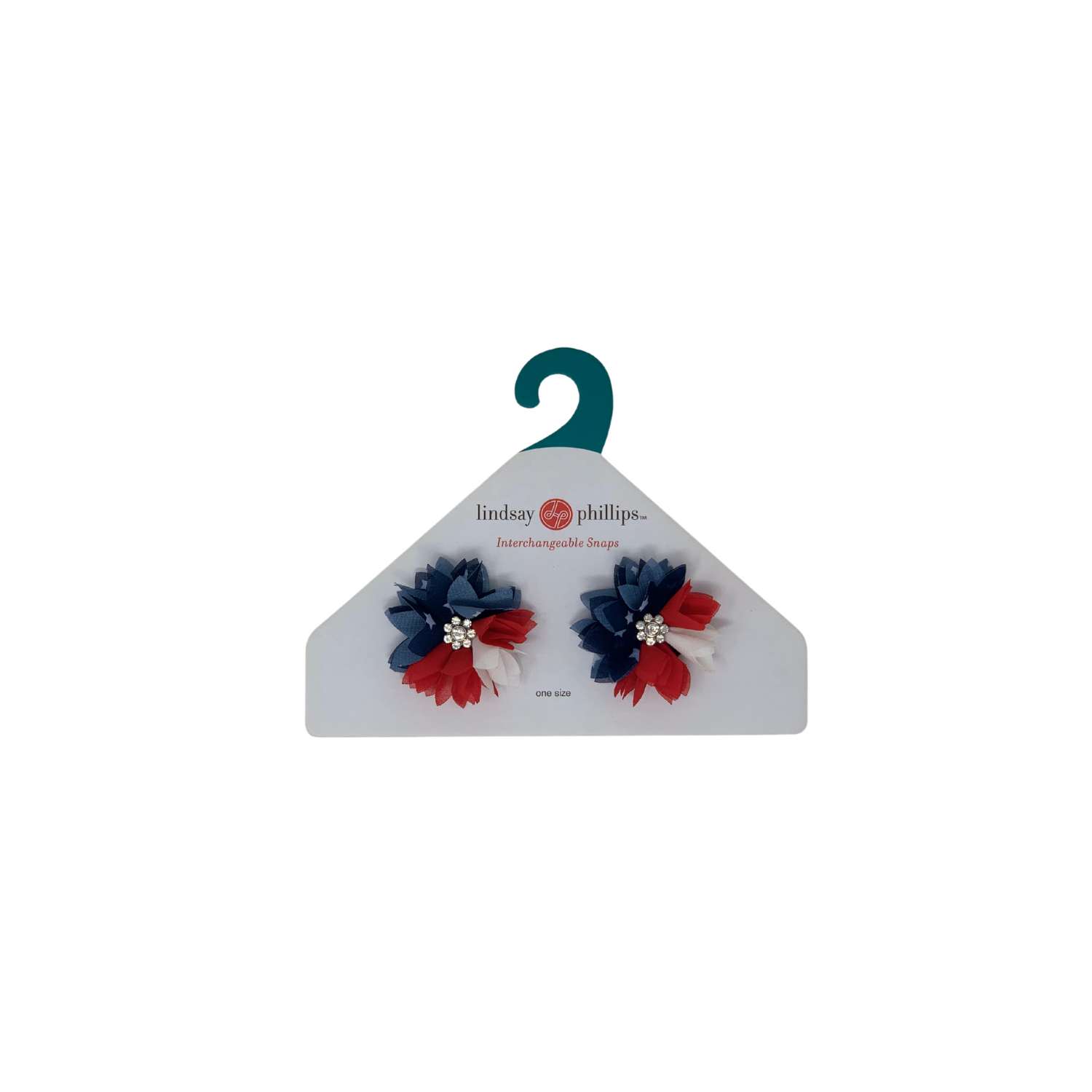 The Dolly is a red, white, and blue chiffon snap featuring a crystal center, measuring 55 mm. Snaps are sold in pairs.