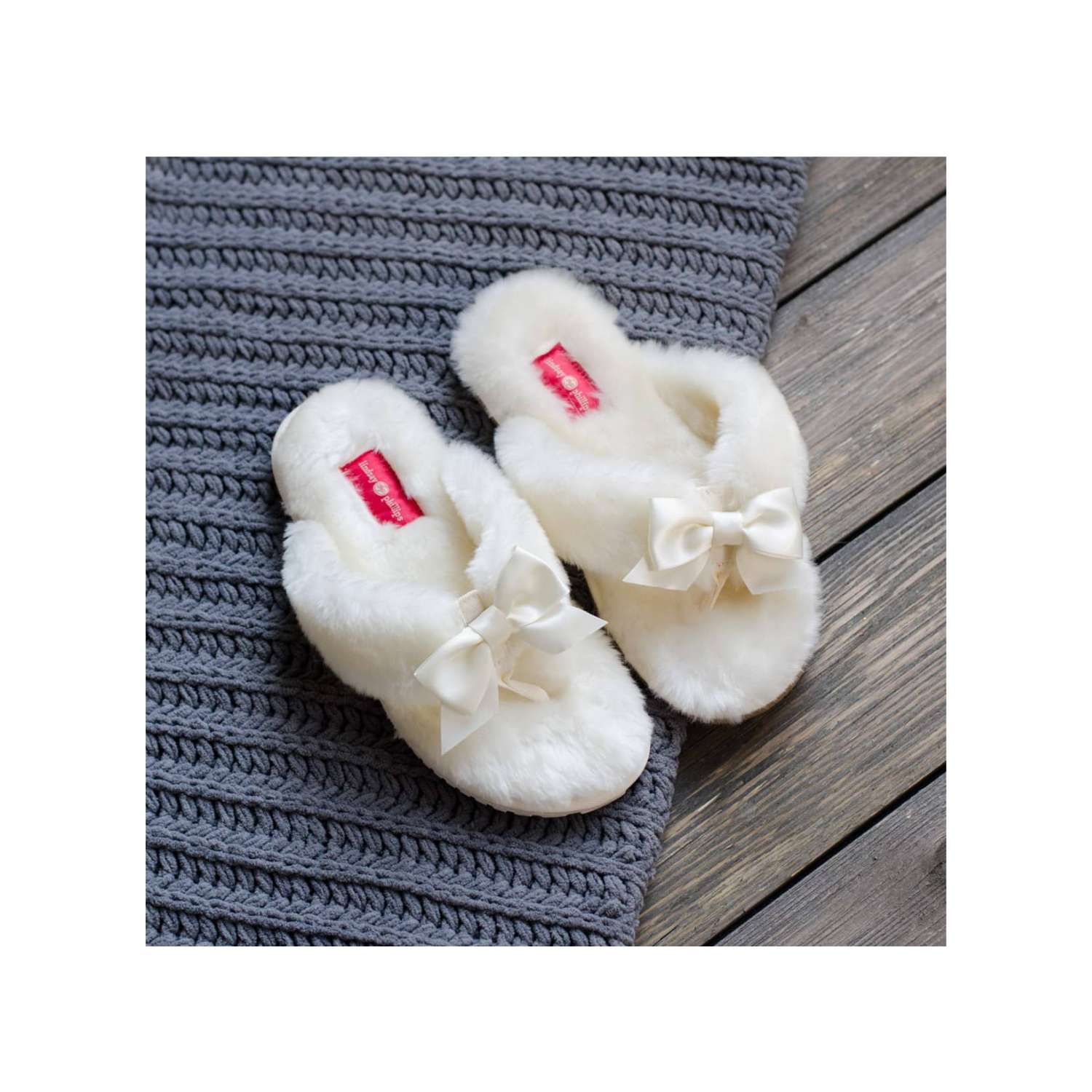 The Kat Cream is a faux fur slipper with a signature satin bow snap.