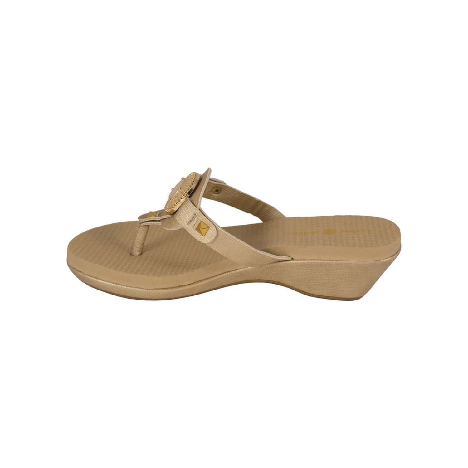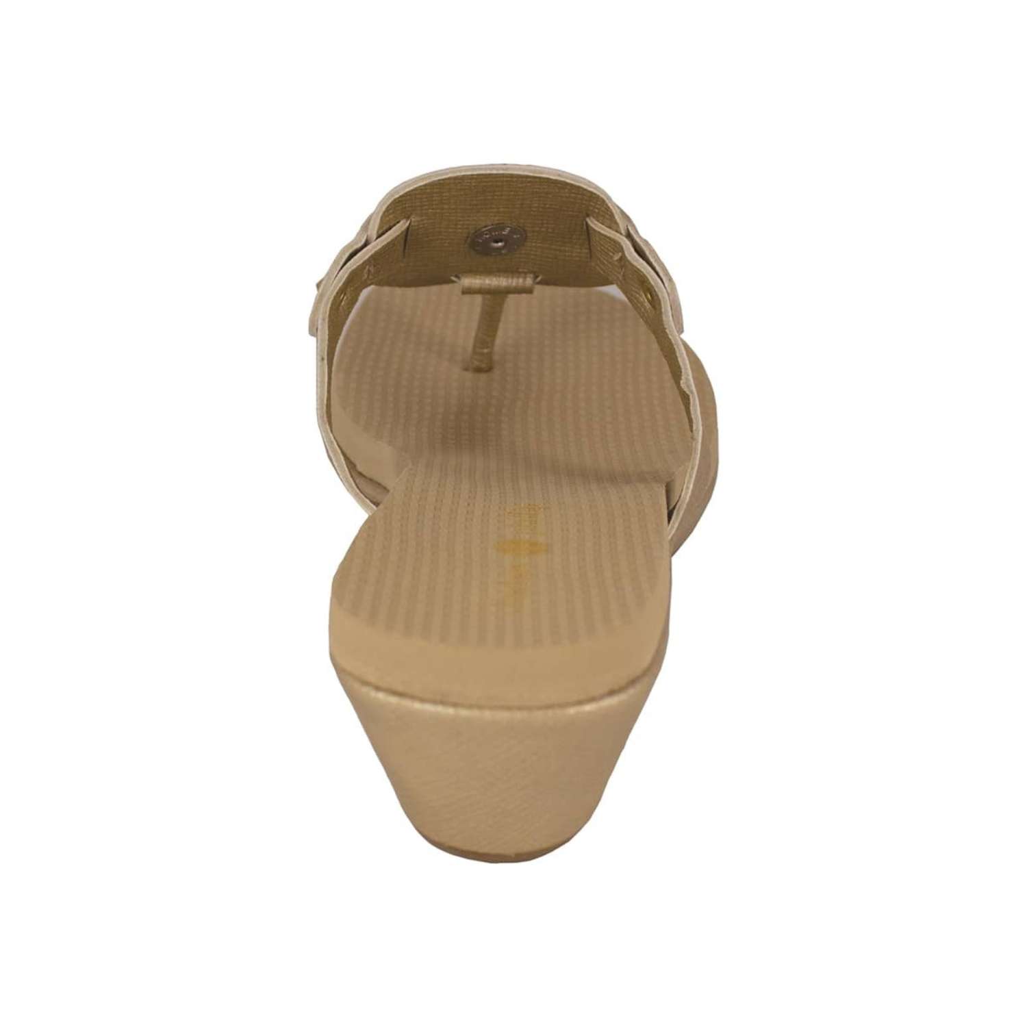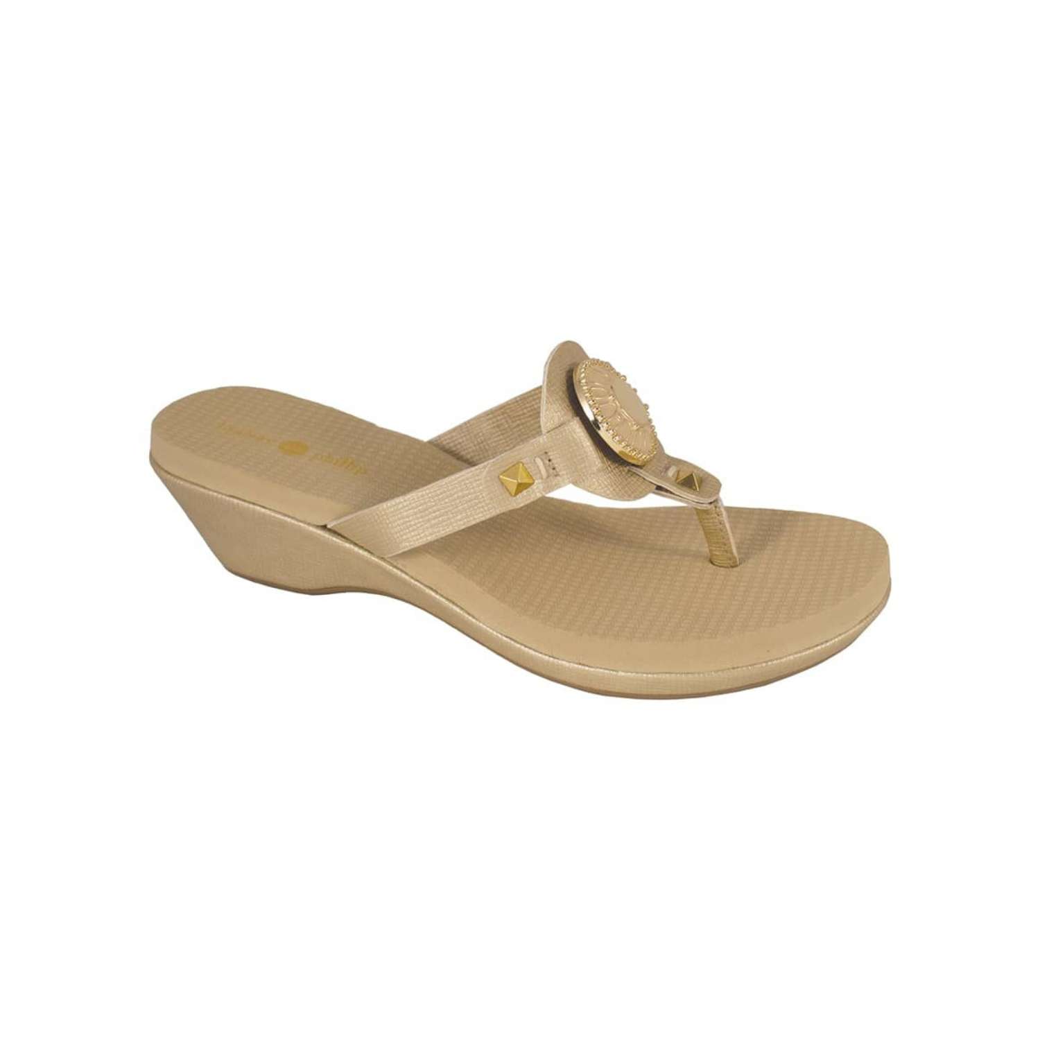The Lexi Gold is a 1 3/4" molded platform wedge with yoga mat footbed and gold textured PU upper and wrap with a gold and ivory enamel signature snap.