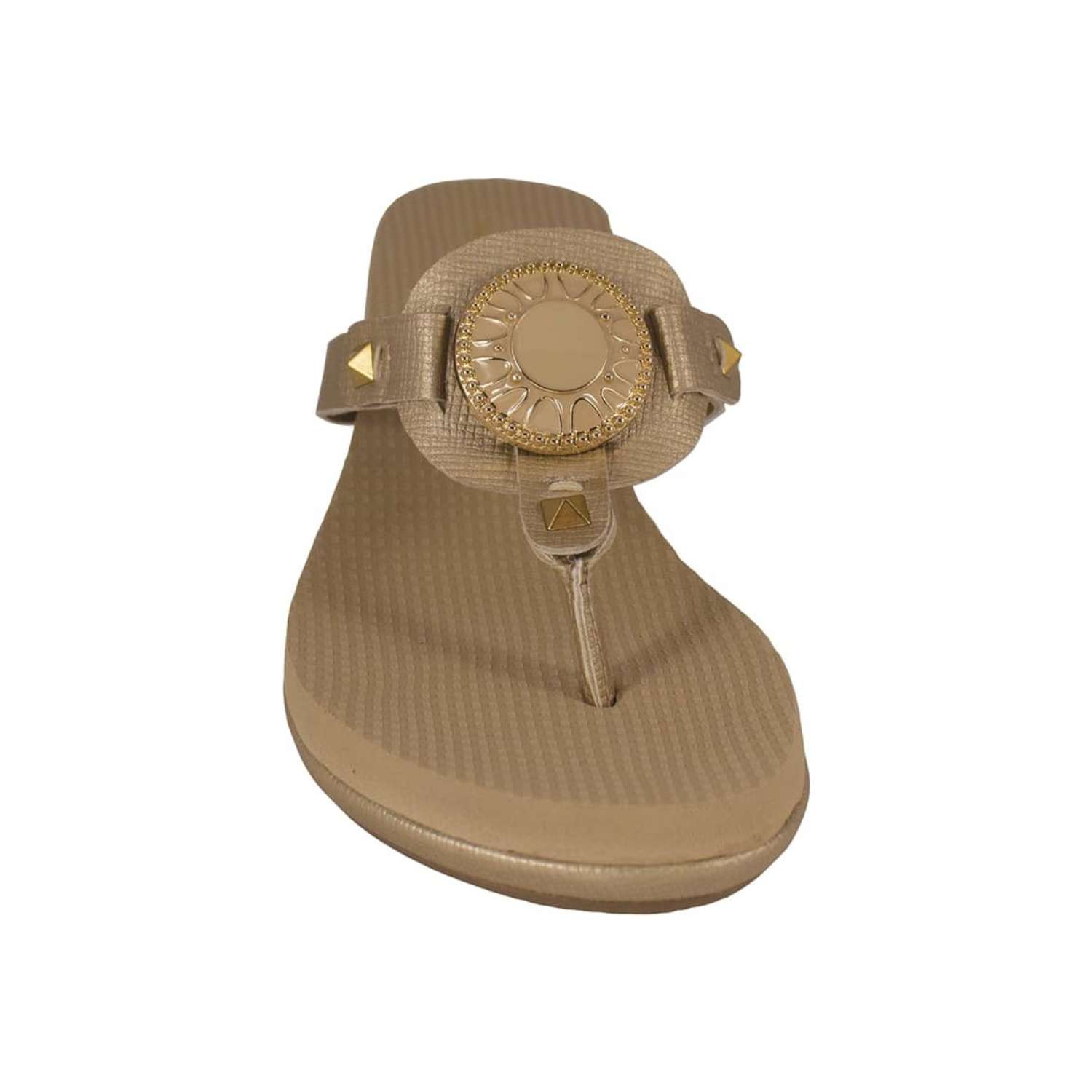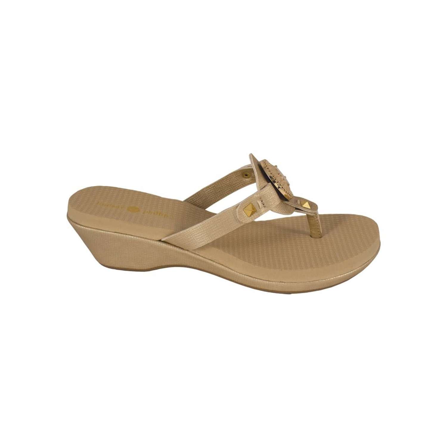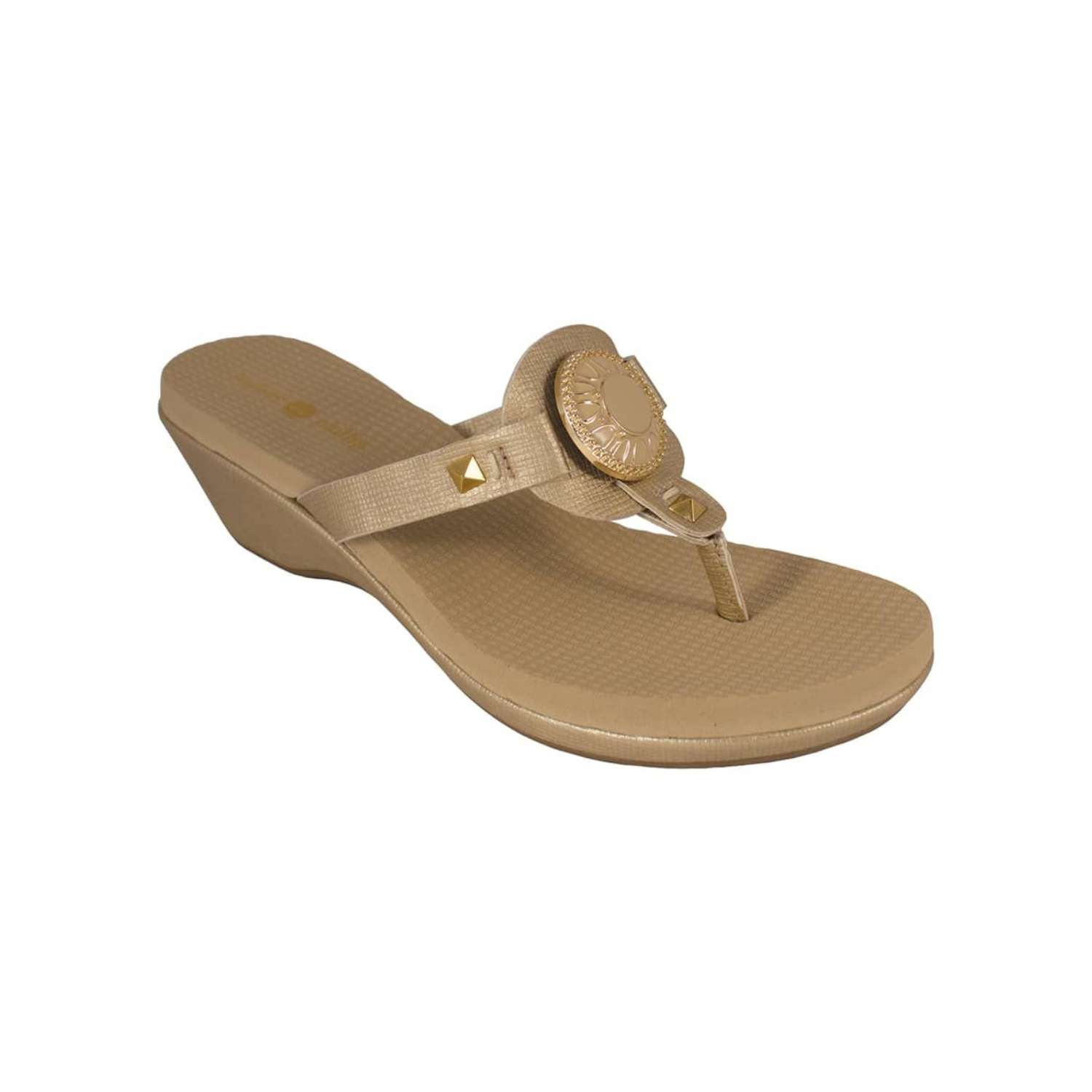 The Lexi Gold is a 1 3/4" molded platform wedge with yoga mat footbed and gold textured PU upper and wrap with a gold and ivory enamel signature snap.
