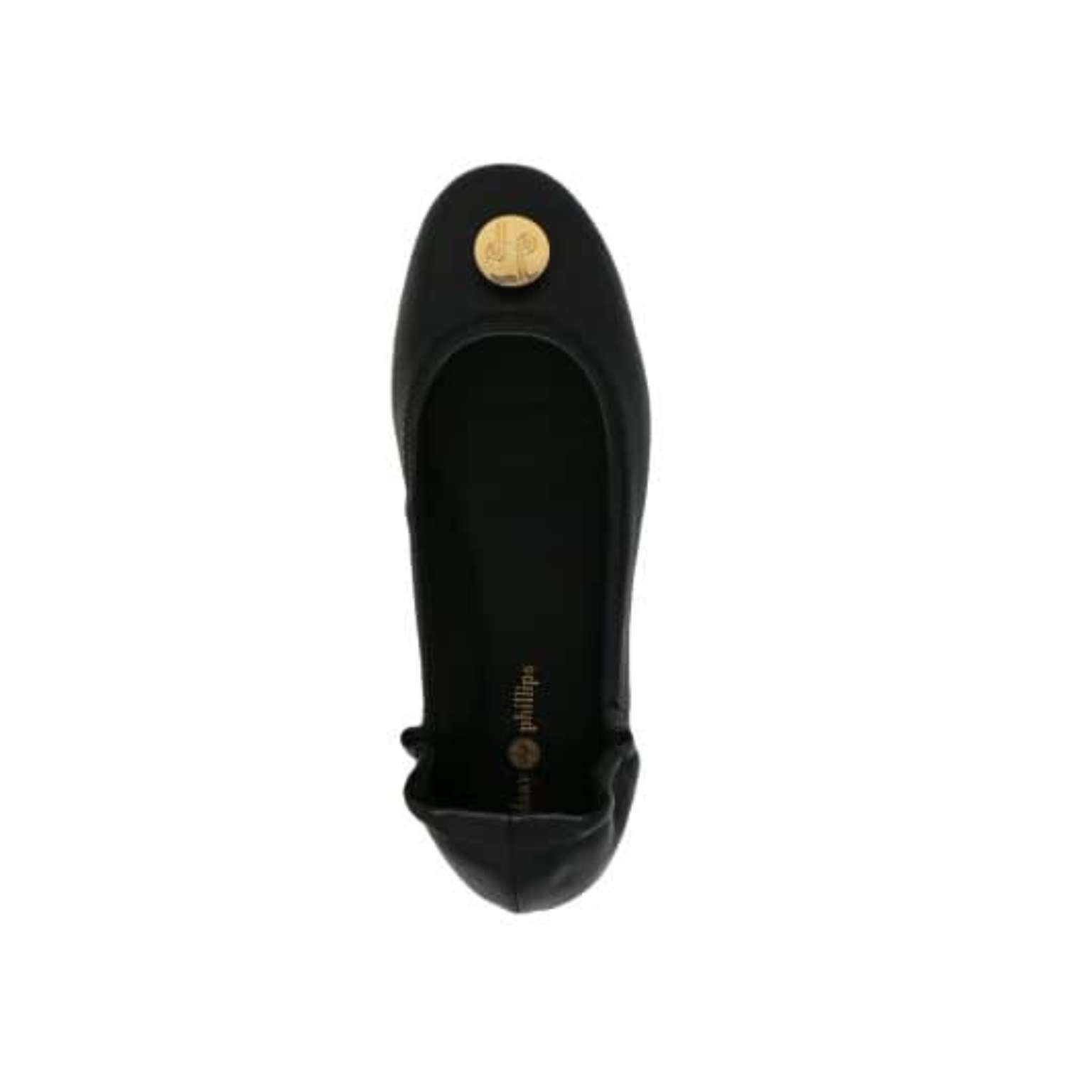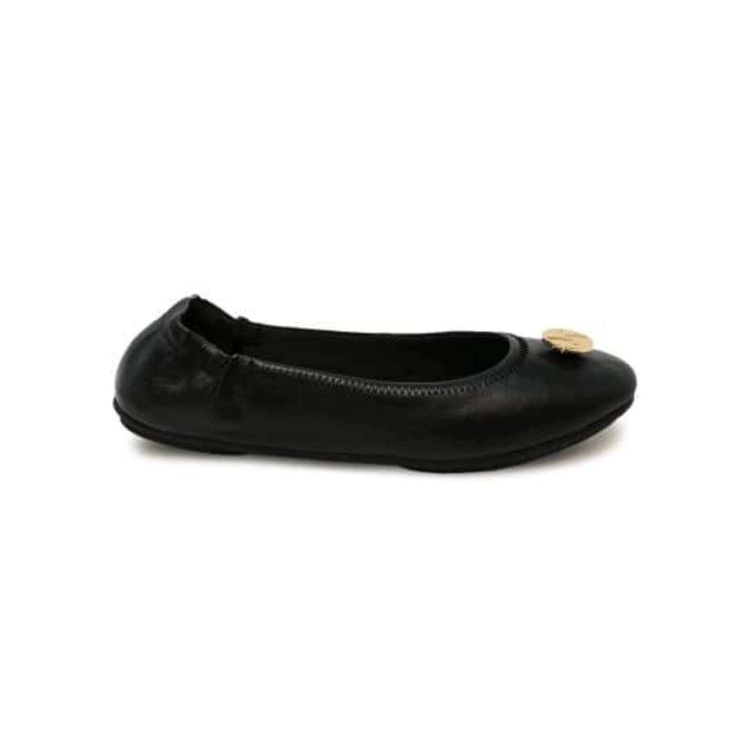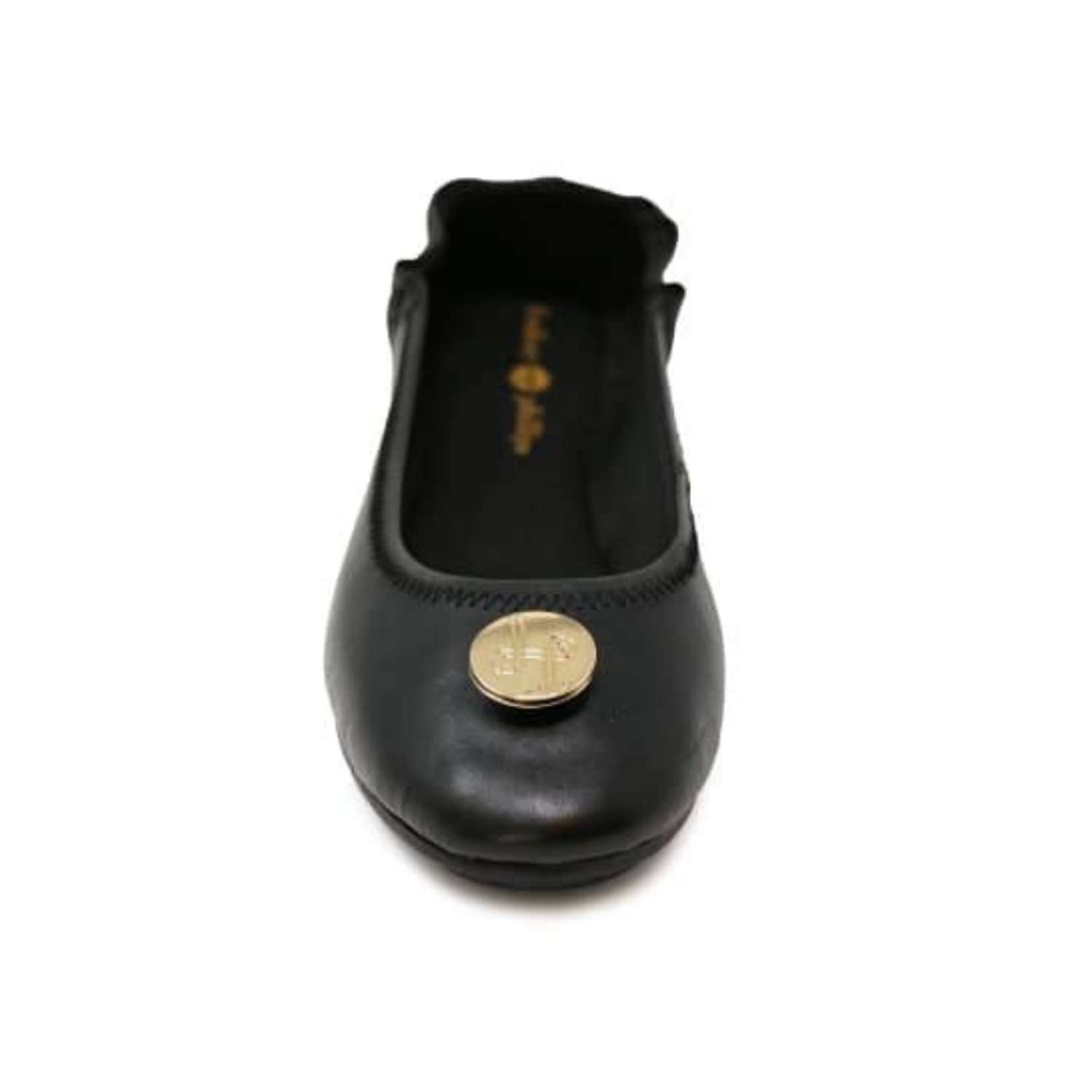 The Liv Black is a leather ballet flat with elastic back and memory foam foot bed and a gold LP logo signature snap.