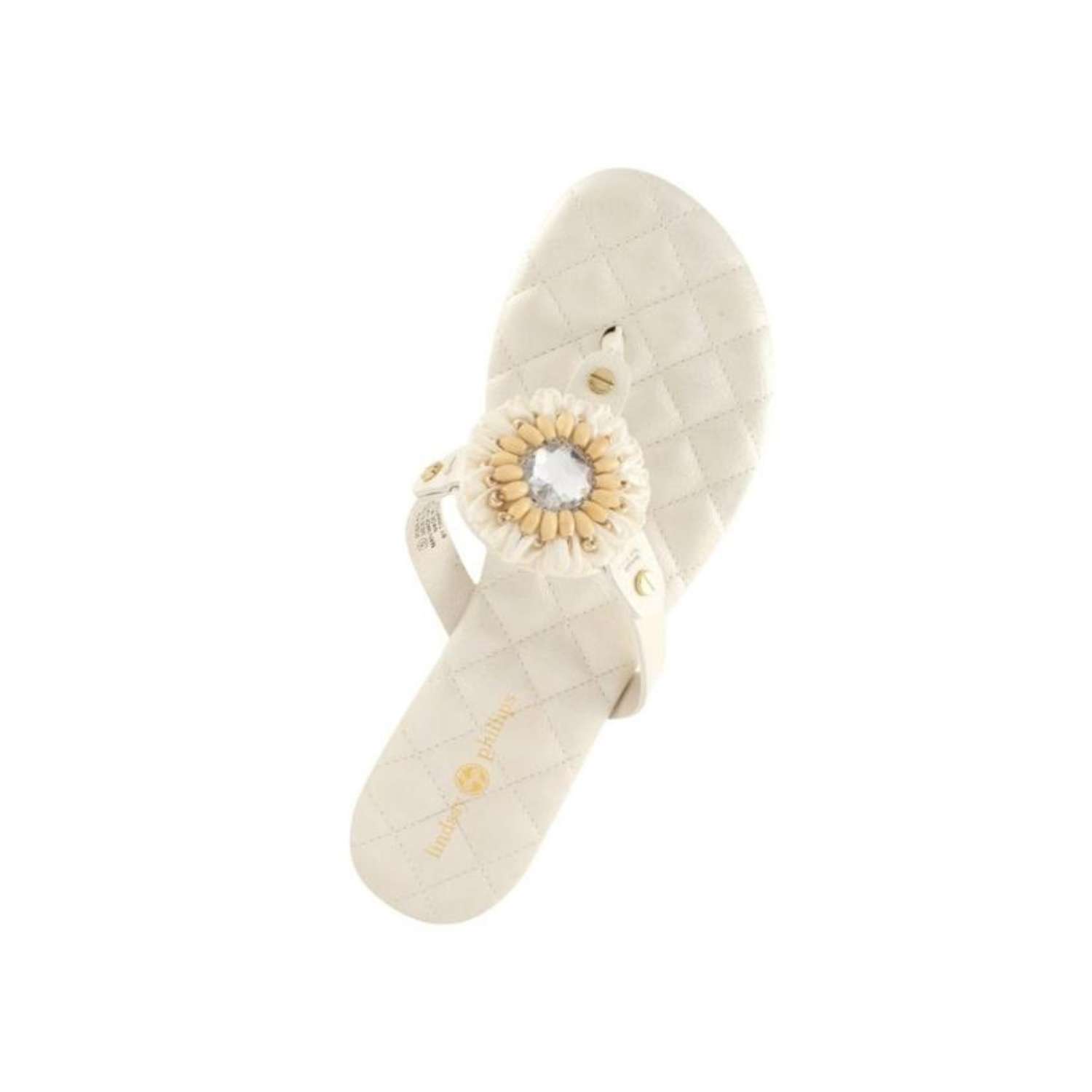 The Rosie Quilted Ivory is a pancake flat thong slide sandal and a neutral and ivory raffia flower signature snap.